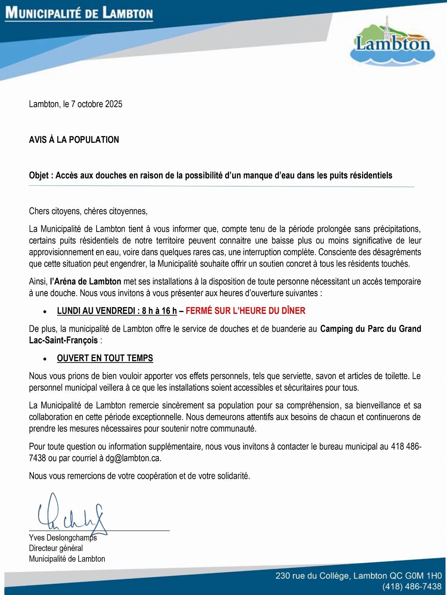 En raison du manque de précipitations, certains puits résidentiels sont temporairement à sec. Afin de soutenir les citoyens touchés, la Municipalité de Lambton offre l'accès aux douches à l'Aréna ainsi qu'un accès aux douches et à la buanderie au Camping du Parc du Grand lac Saint-François.