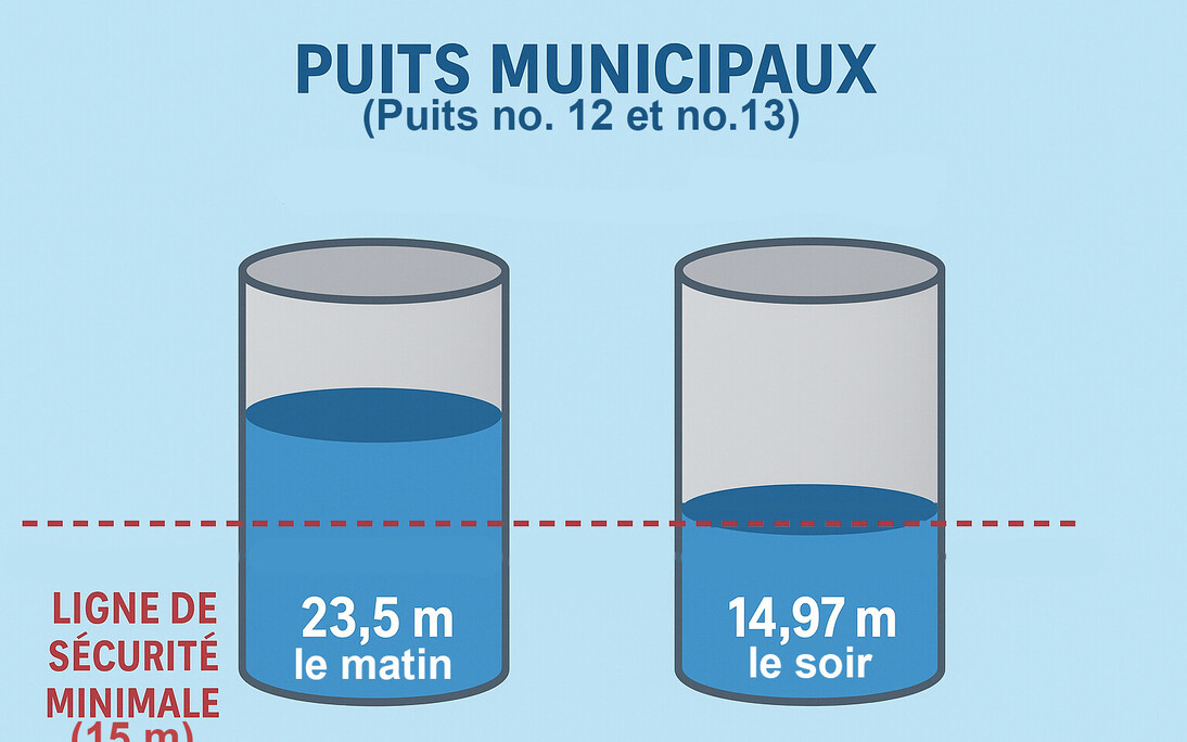 Nos installations comptent 7 puits municipaux. La consommation actuelle par minute de la population est de 400L d'eau, ce qui est obtenu par 5 de nos 7 puits. Les puits no 12 et no 13, quant à eux, représentent notre plus grand volume d'eau. Ceux-ci sont donc essentiels à notre approvisionnement et atteignent actuellement presque leur niveau minimal de sécurité fixé à 15 mètres. Le matin, leur niveau est à 23,5 m et en soirée, leur niveau descend à 14,97 mètres, ce qui nous oblige à fermer temporairement ces puits afin de leur permettre de se rétablir.